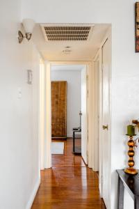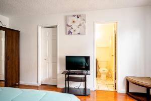This air-conditioned apartment comprises one bedroom with three beds, two bathrooms including a private bathroom and an additional shared bathroom outside the room, as well as a living room area. Guests can enjoy amenities such as heating, a washing machine, and a flat-screen TV for entertainment.
