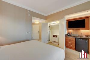 Spacious, clean apartment had a big comfortable bed, very good sized bathroom with jacuzzi bath, and kitchen set up, the view from the balcony was amazing and the elevator was fast. Friendly front desk staff made check-in a breeze. The location was great, just a few minutes walk to The Strip through MGM Grand in a peaceful area away from the madness.