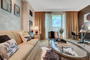 The spacious suite includes one bedroom with two beds, a living room furnished with a sofa bed and seating area, as well as an equipped kitchenette featuring a microwave, refrigerator, stovetop, kitchenware, dining table and tea and coffee making facilities. The bathroom offers both a bathtub or walk-in shower with complimentary toiletries alongside essentials like towels and bed linen. Additional in-room amenities include soundproof walls for privacy, air conditioning, heating, alarm clock, iron, safety deposit box, work desk, wardrobe closet, dressing room, carpeted floors combined with tile or marble flooring,