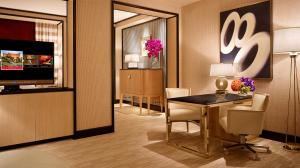The hotel featured excellent facilities and high-quality food. The casino was enjoyable and less crowded compared to others on the Strip. A tower suite upgrade provided stunning views of the Strip, including the Palazzo and Trump hotels. Staff performance consistently met top-class standards from check-in to check-out. Pool amenities were superior, complemented by an impressive selection of restaurants within the property.
